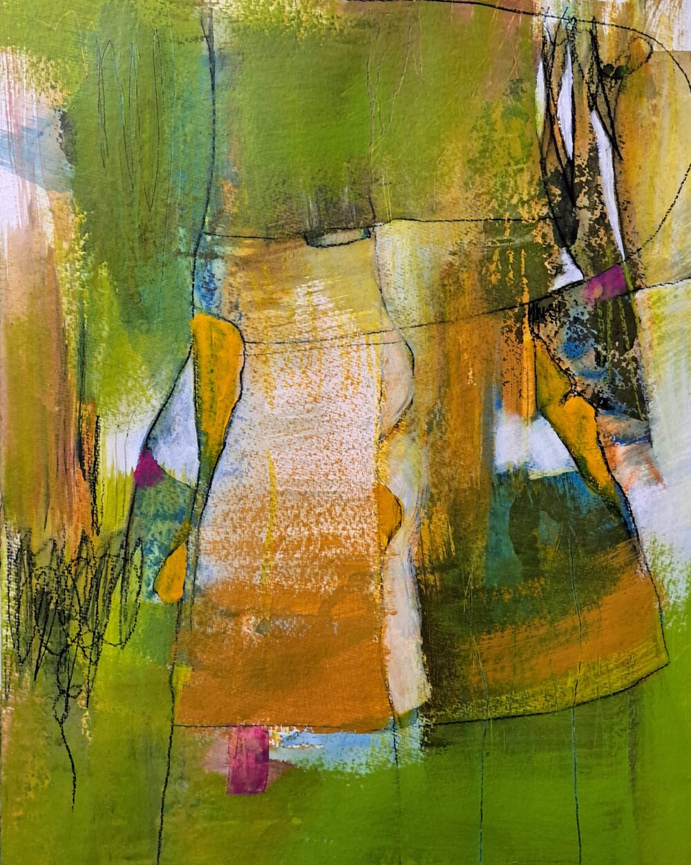 Dieses Bild entfaltet sich in einem Dialog zwischen Struktur und Spontaneität – einer lyrischen Abstraktion, in der erdige Ockertöne, moosige Grüntöne und ein Hauch von Rotviolett miteinander atmen. Ein Gespräch zwischen Farbe und Textur. Es entsteht eine kapselartige Form, die sowohl Landung als auch Loslassen suggeriert. Das Werk balanciert Offenheit und Begrenzung und lädt den Betrachter ein, durch Schichten von Gesten und Farbtönen zu wandern und dabei den Rhythmus in den Zwischenräumen zu finden.